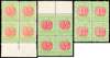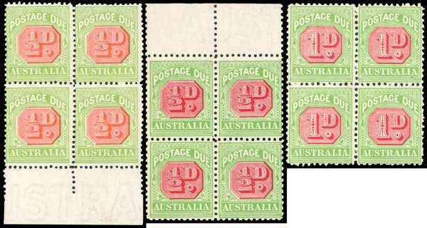 Postage Due. 1913-23, perf 12½ (line) ½d scarlet and pale yellow-green, and perf 11 ½d and 1d rosine and bright apple-green, each an unmounted block of four, both ½d blocks marginal. cat £300++