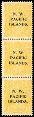 1915-16 4d chrome-yellow, type 6 opt, wmk 5 of Australia, vertical strip of three showing opt types ‘a’, ‘b’ and ‘c’ se-tenant, o.g., fractionally toned gum still fine fresh appearance, very scarce in this form. SG 70b, cat £1100