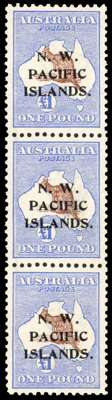 1915-16 £1 brown and ultramarine, wmk 2 of Australia, type 6 opt, vertical strip of three showing opt types ‘a’, ‘b’ and ‘c’ se-tenant, brilliant o.g. with the lower pair remaining unmounted, attractive and very scarce. SG 85, cat £3200+