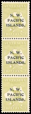 1915-16 3d yellow-olive, type 6 opt, wmk 6 of Australia, vertical strip of three showing opt types ‘a’, ‘b’ and ‘c’ se-tenant, the upper pair Die I and II se-tenant, the bottom stamp Die II, unmounted o.g., suspicion of storage toning on reverse, but a very scarce multiple of fine appearance. SG 96a/ab, cat £435+
