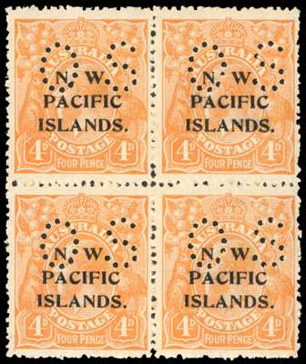 Official. 1919-23 4d yellow-orange, perf 'OS', wmk 5 of Australia, BLOCK OF 4, o.g., minor perf toning but an exceptionally rare multiple. SG O4, cat £1600