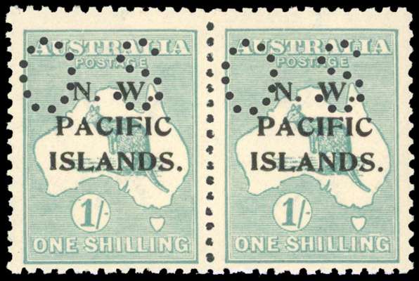 Official. 1919-23 1s pale blue-green, perf ‘OS’, wmk 6 of Australia, horizontal pair, unmounted o.g., a very scarce multiple. SG O11b, cat £1500