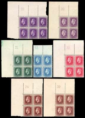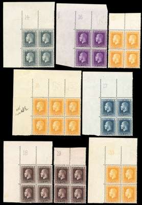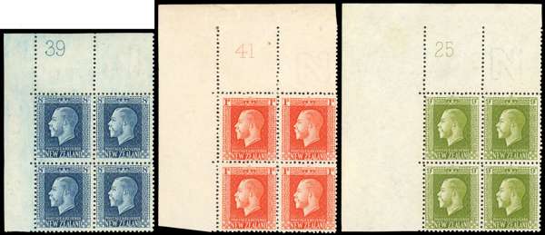 1915-30 set to 1s, perf 14x13½ except 1s perf 14x14½, upper left corner blocks of 4 or 6 with plate number, mint o.g., odd minor imperfections and the 2d (plate ‘15’), 3d (plate ‘19’) and 5d lacking left margin still a wonderful and extremely valuable group. SG 416/430c btwn (CP NZ$19,600)