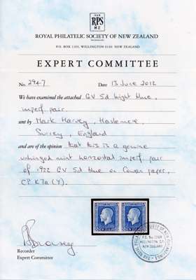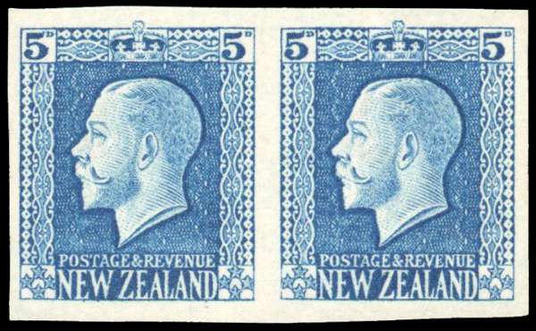 1915-30 5d light blue, horizontal pair, error IMPERFORATE, brilliant unmounted o.g. RPSNZ cert (2012). SG 424a, cat £600