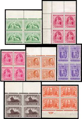 1920 Victory set of 6 to 1s plus 1d bright carmine, blocks of 4, o.g. with the stamps mostly unmounted, odd minor blemish but mainly fine, uncommon multiples. SG 453/458, cat £310+