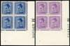 1926-34 2s deep blue, 3s mauve, Jones paper, matching lower right corner blocks of four with sheet numbers, fine large part o.g., an attractive and scarce pair. SG 466/467, cat £880+
