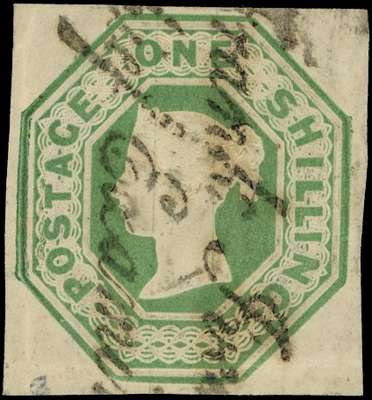 1854 1s Green (Die W.W.2). Fine four margin example bearing a partial strike of the ‘Frank Ives Scudamore/Chief Examiner’ handstamp. Vertical crease at left and foot. Very scarce. Spec. H1(2). Cat £6000.
