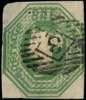 1854 1s Green (Die W.W.2). Used example showing complete double impression cancelled by a London City “3” numeral. Showing significant thinning on reverse and a small pinhole nevertheless a magnificent example of this rare and extremely visual embossed variety. Spec. H1(1)d. SG55. Cat £20,000.