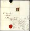 1840 1d Black Pl.1a. ‘May date’ (May 9th 1840). Wrapper sent from London to Plymouth. Bearing a 1d Black pl.1a (AK) tied by red MC'S. Dispatch datestamp on reverse for MY.9.1840. Some minor staining as usually seen. Spec. AS2td. Cat £4800