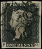 1840 1d Black Pl.1b. Used close to large four margin example (PG) cancelled by a black London No.1. MC. Spec AS5wa. Rare cancel so fine. Cat £18,000.