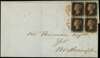 1840 1d Black Pl.6. Attractive lettersheet addressed to Northampton bearing a block of four 1840 1d Black Pl.6. lettered BA-CB just shaved at sides nevertheless an attractive multiple on cover. Backstamped by a London datestamp for FE.4.1841. Spec. AS41. 1989 RPS Cert. Cat £18,000 as a used block of four off cover.