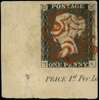 1840 1d Black Pl.7. Used bottom left hand corner marginal example lettered TA, showing part sheet inscription and ‘7’ plate number. Cleaned and showing a heavy reinforced crease in margin. A spectacular positional piece.