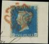 1840 2d Milky blue Pl.1. Used large four margin example (FF) tied by a red MC. Scarce shade so fine. Spec. DS3. 1991 RPS Cert. Cat £3000.