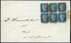 1840 2d Blue Pl.1. Wrapper sent from London to Wiveliscombe, Somerset bearing a block of six 1840 2d Blues Pl.1. tied by red MC's just shaved at left and lower right of block as to be expected nevertheless a spectacular multiple on cover. Some internal reinforcements to the wrapper.