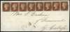1841 1d Red-brown Pl.30. part wrapper bearing a horizontal strip of eight 1d Red-Brown Pl.30 lettered QA-QH cancelled by superb strikes of Scottish thin lined MC's. offered with an additional Scottish Large centre MC example on a single 1841 1d Red-brown.