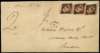1841 1d Red-brown Pl.39. Wrapper sent from Ashford, Co Wicklow, Ireland to London bearing a top right hand corner marginal vertical strip of three showing plate number ‘39’ cancelled by Ashford ‘14’ Irish numerals. With manuscript ‘2’ and endorsed ‘More to pay’ at left. 2009 BPA Cert.