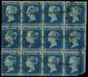 1854 2d Blue (Die I, Alph I, Wmk Small Crown, Perf 16). Block of twelve lettered KC-MF all bearing strikes of the ‘Frank Ives Scudamore/Chief Examiner’ handstamp. MF showing significant damage and several reinforced perforations and bends as to be expected on such a large multiple. Scarce. Spec. F1(1). Cat £7500.