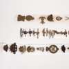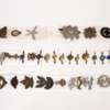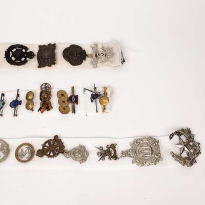 32 British Cap Badges and 30 Tie Pins, mounted on cloth strips