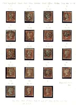 1841 1d Red-brown. Very fine group of nineteen adhesives cancelled by London No.1-12 MC's. With additional No.2, No.4, 2x additional No.6's, No.8, No.9 & No.12 MC's. Mixed condition but mostly three-four margin examples with clear strikes. Well worth viewing. Spec. B1(1)ua-ul. Cat £4800+ (1)