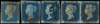 1840 2d Blue Pl.1. Used group of four consisting of three single examples and a horizontal pair each displaying varieties. PI corner lines recut red MC, FC double letter F, LH constant variety in H square and ED-EE pair showing re-entry on ED. Fine group some touching or cut close and a corner bends but f nice appearance and cancels clear of varieties. SG5, Spec DS5. Cat £5600+. (4)