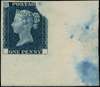 1840 1d Rainbow trial (State 2). Bottom right hand corner marginal example printed in deep blue on stout white wove paper. Spec. DP20(2)b.