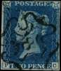 1840 2d Blue Pl.2. Used example just shaved at top left cancelled by a crisply struck black London No.8. MC. A presentable example of this difficult cancellation on this issue. SG5, Spec. ASAS8wh. Cat £14,000.