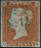 1841 Orange-brown Pl.21 (OE). Used four margin example cancelled by a crisp blue framed ‘PyP No.15 (Handsworth)’ handstamp as a sole cancellation. Small thin in margin above T of Postage. Scarce shade and cancellation combination. SG12, Spec. BS10wf. 2010 RPS Cert.