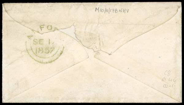 1856 1d Red-brown Pl.46. (Die II, Alphabet III, Wmk. Large Crown, Perf 14). Envelope sent from Alford, Aberdeenshire to Aberdeen bearing a 1d Red-brown Pl.46 (SG29) lettered QI, tied by a green Alford town postmark for SP.17.1857. with a matching datestamp on reverse. SG29, Spec. C8(1)wd. Cat. £3500.