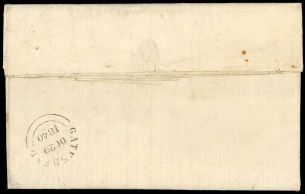 1840 1d Black Pl.6. Very fine used four margin example neatly tied to a printed price list from Gateshead nursery regarding the prices of trees, sent from Gateshead to Hexham. bearing a 1d black Pl.6. (MK) showing double letter M variety, tied by a distinctive brown MC of Gateshead. Backstamped Gateshead for OC.29.1840. A wonderful pre-printed entire. SG2, AS41b.