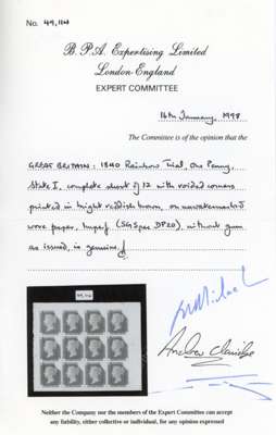 1840 1d Rainbow Trials (State 1). Complete sheet of twelve impressions printed in bright reddish brown on unwatermarked white wove paper without gum as issued. Very rare. Ex. Vullo. Spec. DP20(1). 1998 BPA Cert. Cat £50,000.