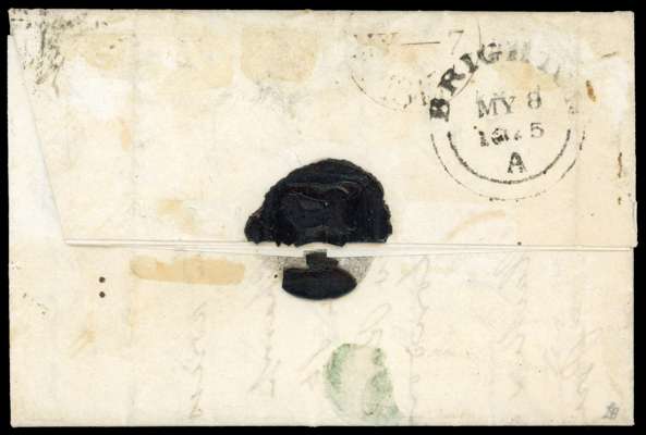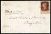1841 1d Red-brown Pl.51. Fine entire sent within London to Brighton bearing a four margin bottom marginal 1d Red-brown Pl.51 (TC) showing sheet marginal inscription "f 12 £1…. Per S" cancelled by a London City ‘13’ numeral. Backstamped by London datestamps for MY.7.1845 and a Brighton arrival for the following day. SG8, Spec. BS40.