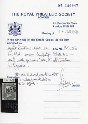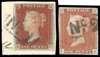 1841 1d Red-brown Pl.56 & 64. Two four margin used examples DD Pl.56 tied to a small piece by a black, boxed “No.1” handstamp of Littlehampton and TA, Pl.64 cancelled by a black, boxed “NO.2" handstamp of Harbertonford. A wonderful duo. TA accompanied by a 1990 RPS Cert. SG8, Spec. BS45 & BS53.
