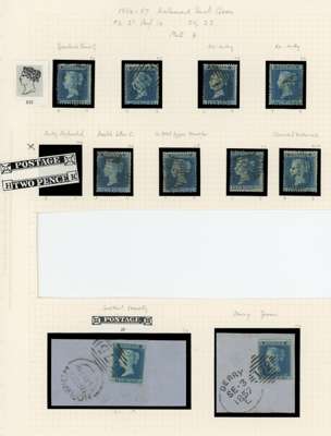 1855 2d Blue Pl.4 (SG23, Die I, Alphabet II, Wmk. Small Crown, Perf 14). A fine group of ten used examples including a watermark inverted example (DI), Spectacles variety (BH), various re-entries, double letters and constant varieties. An Interesting group. SG23, Spec. F2. Cat £3,750+. (10)