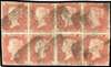 1841 1d Red-brown Pl.166. (Wmk. Inverted, Alphabet II). Used block of eight lettered EI-FL showing watermark inverted variety and cancelled by Scottish numerals. Margins trimmed at top, soiling and some overall wrinkling. As to be expected on a such a multiple. Rare watermark variety in such a block. SG8wi, B2(1)c. Cat £3,200 as singles.