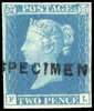 1841 2d Blue Pl.3 (FL). Very fine and fresh unused o.g. four margin example, overprinted "SPECIMEN" type 1. Scarce. SG14s, Spec. E1(2)s. Cat £5500.