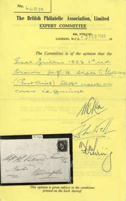 1853 1d Red brown Pl.164 Government perforation trial. Entire sent from Liverpool to Warrington bearing a 1d red-brown Pl.164 (SG 16c) lettered RJ cancelled by a Liverpool ‘466’ numeral, dated on reverse SP.24.1853.These perforation trials had previously been attributed to trials of the Napier machine but as mentioned on Page.246 of SG QV part 1 Vol 1 it is now considered more likely that they were produced on the archer machine. SG16c. 1969 BPA Cert.