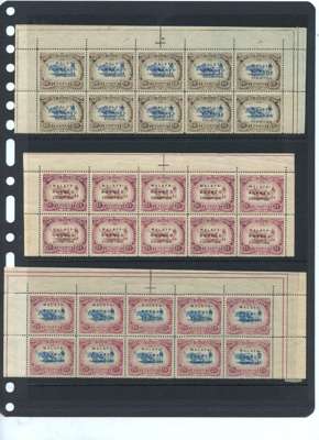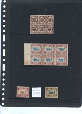 1922 Malaya-Borneo Exhibition 10c watermark Script, 21c and 25c watermark MCA top two rows of each, o.g. with just one 10c hinged and R1/5 of the 25c block creased. Stamp 2 in each raised stop, stamp 8 oval ‘O’. Also 3c block of six, one with raised stop, unmounted o.g.; another 25c block of six unmounted, one with raised stop and another with oval ‘O', and two toned singles with minor varieties. SG 41/8