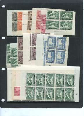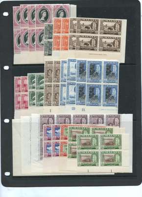 1953-63 unmounted o.g. collection with Coronation Plate blocks (4), 1957 set with perfs and duplicated blocks with many Plate blocks (both $5 perfs) including bottom two rows of 10c deep maroon with Plate 1C and imprint, good gum; 1961-3 blocks with four x 8c including a block of ten 8c deep green, good gum but a couple lightly toned. Generally the gum varies from slightly to considerably toned; viewing is advised. SG 82-94a, 96-102