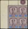 1898 $3 purple and blue top left corner block of four with Plate number 1, fine o.g., hinged on the selvedge only. SG 51, £300