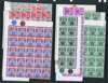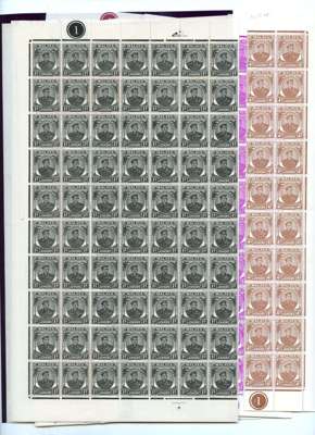 1949-58 values in large blocks. 1c sheet and Plate block of 40; 2c orange sheet and Plate block of 20, yellow-orange sheet in two halves; 3c two Plate blocks of 25; 4c Plate blocks of 30, 40 and the pale brown shade Plate block of 20; 5c Plate blocks of 20 and 16; 6c two sheets, Plate blocks of 30 and 20; 8c red Plate blocks of 20, 10 and plain block of 20; 8c green Plate block of 16; 10c half sheet (splitting) and Plate blocks of 20 and 15; 15c two Plate blocks of 10; 20c black and green Plate block of 10; 40c Plate block of 20; $1 Plate block of 25. Some separations and the occasional minor defect, but generally very fine and a most unusual accumulation. SG 133/145, £2799