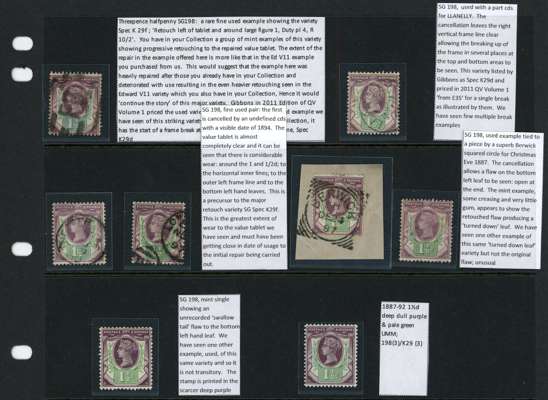 1887-92 1½d dull purple & pale green group of mainly used with heavily-postmarked single, R10/2 retouched tablet, and a precursor showing wear; CDS-used single with multiple breaks in right frame; mint and used singles with differing damage to lower left leaf; and two mint singles, one with 'swallow tail' to lower left leaf. SG 198 var