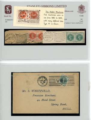 Postal History. 1887-1901 machine cancels on Jubilees. ½d vermilion vertical pair on piece with fine strike of Hoster machine for March 8th 1887; 1899 ½d vermilion pieces with Bickerdike No. 2 and Boston No. 2 machines, and a cover with Boston No. 2; matched pairs of ½ds vermilion and blue-green with Liverpool Boston Nos. 3 and 4 on pieces; 1900 ½d vermilion (printed rate) cover with Liverpool Bickerdike No. 1, and another printed matter cover (1901) with ½d blue-green, Liverpool Bickerdike No. 1