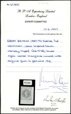 1887 ½d vermilion lower right corner example, imperforate, unmounted o.g. BPA Certificate (1997), ex Aureum. SG 197d