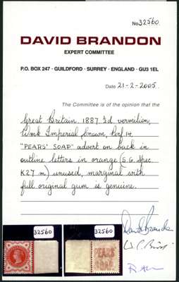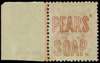 1887 Jubilee ½d vermilion right marginal example with PEARS' SOAP advertisement in orange outline letters, unmounted o.g. Brandon Certificate (2005). SG 197 var, K27m