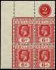 1912-25 6c carmine (type A) wmk MCA, variety wmk sideways (Crown to right of CA), upper left corner block of 4 with plate number '2' (SG 306a). A scarce multiple, with the variety, upper pair u/m otherwise fine o.g.