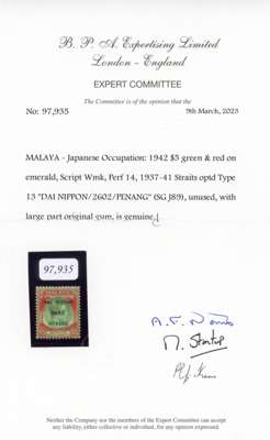 1942 (15 Apr) Penang $5 green and red/emerald, type 13 opt, large part o.g. A very scarce stamp, with lovely fresh appearance. BPA cert (2023). SG J89 cat £900
