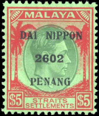 Malaya Japanese Occupation 1942 (15 Apr) Penang $5 green and red/emerald SG J89
