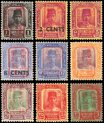 Malaya Japanese Occupation 1942 Trengganu 1c to $3 RED CHOPS part set of nine