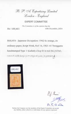 1942 (Sept) Trengganu 6c orange (ordinary paper), chop 'E' in RED, fresh large part o.g. An extremely scarce stamp, particularly in this lovely quality. BPA cert (2024) SG J103a