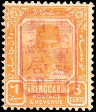Malaya Japanese Occupation 1942 (Sept) Trengganu 6c orange (ordinary paper), chop 'E' in RED SG J103a